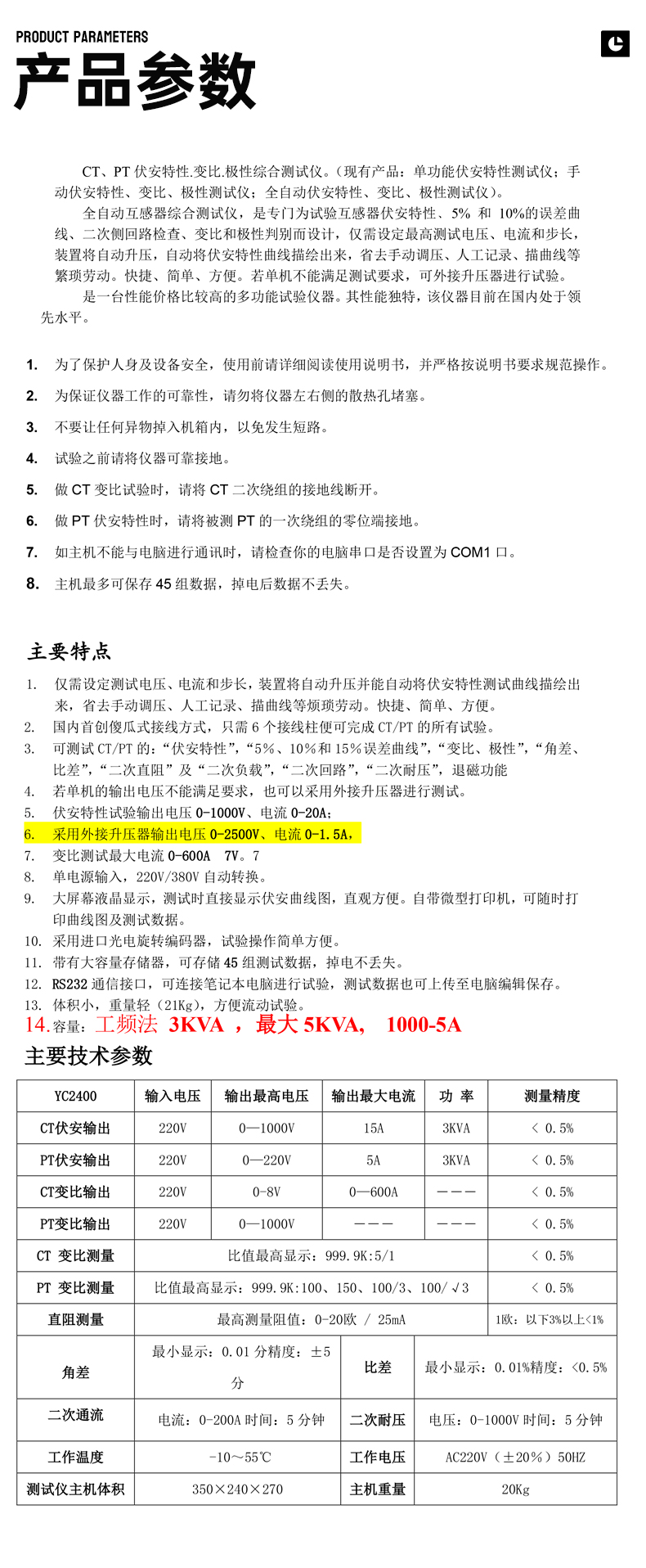 特點(diǎn) | 測(cè)試CT/PT伏安特性、變比和極性、CT5% |