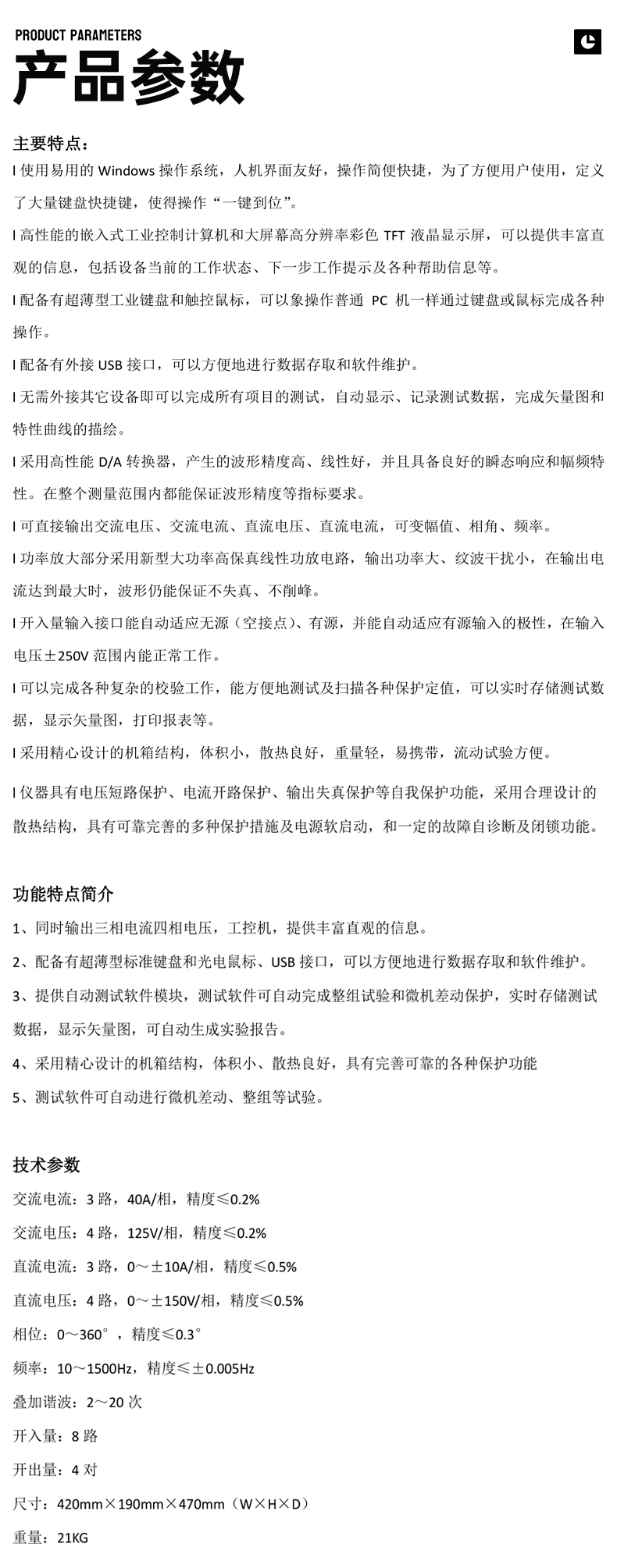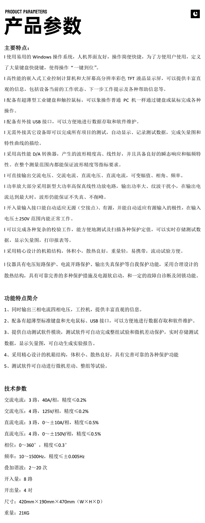 交流電壓源(A、B、C、UX)幅值范圍 | 0-120V/相*6 |