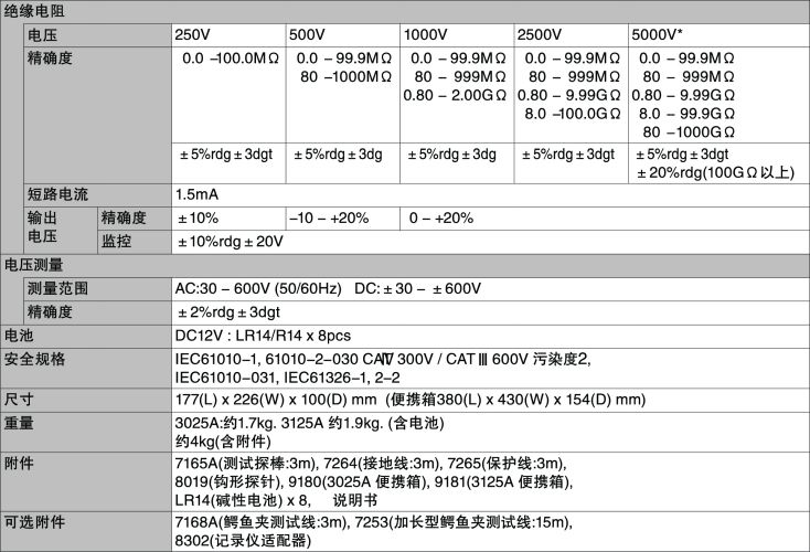 額定測試電壓 | 250/500/1000/2500V |